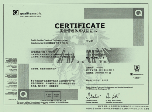 無錫新龍儲罐獲得ISO9001∶2015質量管理體系認證